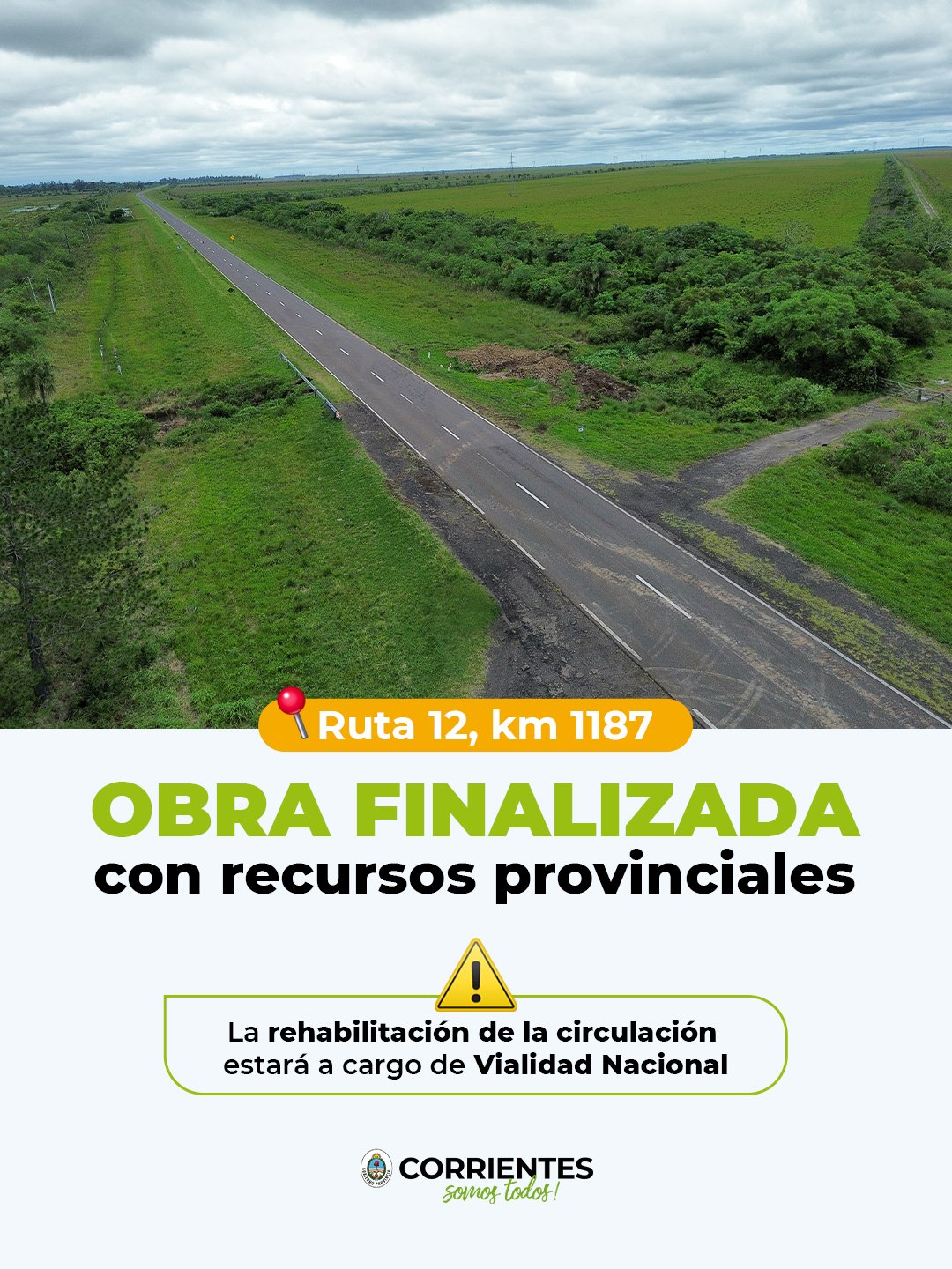 La Dirección Provincial de Vialidad concluyó este jueves por la tarde los trabajos sobre la Ruta Nacional N° 12, en inmediaciones de Itá Ibaté, luego de dos días de intenso trabajo realizado con recursos propios. Las tareas que se ejecutaron permitieron restablecer las condiciones de transitabilidad del sector afectado.