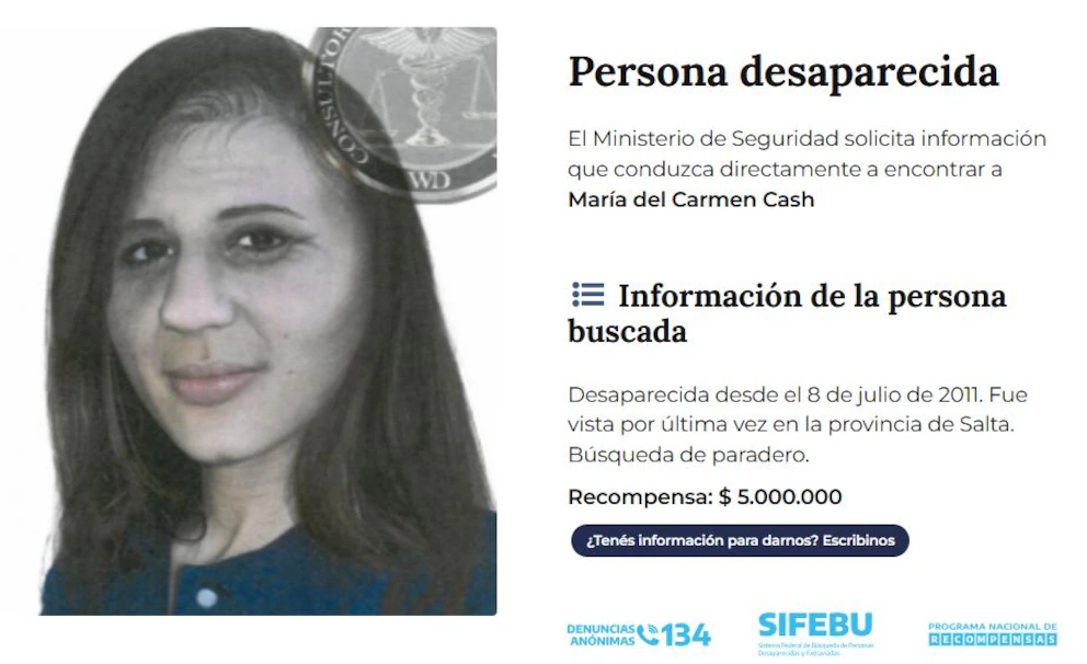 Por datos que lleven al paradero de María Cash, hay una recompensa vigente.
