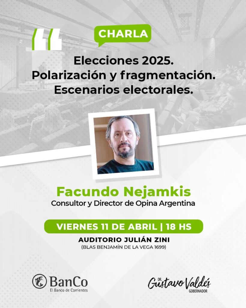 Convocado por el Banco de Corrientes y el Gobierno provincial, el consultor y director de Opina Argentina, Facundo Nejamkis brindará este viernes la charla: «Elecciones 2025, polarización y fragmentación: escenarios electorales».