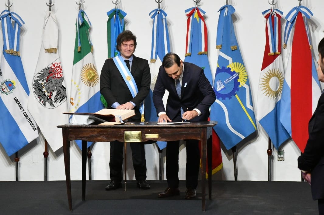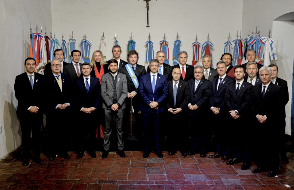El presidente Milei firmó el acta del Pacto de Mayo junto a los gobernadores Raúl Jalil (Catamarca), Leandro Zdero (Chaco), Ignacio Torres (Chubut), Jorge Macri (CABA), Martín Llaryora (Córdoba), Gustavo Valdés (Corrientes), Rogelio Frigerio (Entre Ríos), Carlos Sadir (Jujuy), Alfredo Cornejo (Mendoza), Hugo Passalacqua (Misiones), Rolando Figueroa (Neuquén), Alberto Weretilneck (Río Negro), Gustavo Sáenz (Salta), Marcelo Orrego (San Juan), Claudio Poggi (San Luis), Maximiliano Pullaro (Santa Fe), Gerardo Zamora (Santiago del Estero), Osvaldo Jaldo (Tucumán); el Presidente Provisional del Senado de la Nación, Bartolomé Abdala, y el Presidente de la Cámara de Diputados de la Nación, Martín Menem.