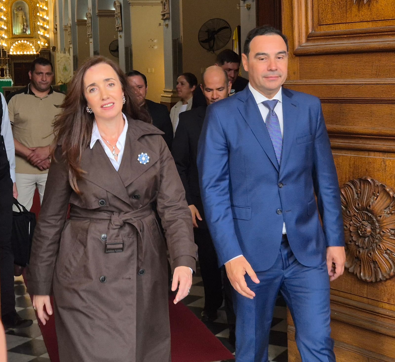 Luego Valdés invitó a Villarruel a conocer la iglesia La Merced, distante a unos cien metros, recorriendo la histórica plaza 25 de Mayo, centro cívico de la ciudad. El mandatario provincial le explicó allí a la Vicepresidente sobre los distintos edificios públicos que rodean el lugar hasta ingresar al templo religioso, donde fueron recibidos por por el cura párroco, también permaneciendo allí un tiempo considerable.