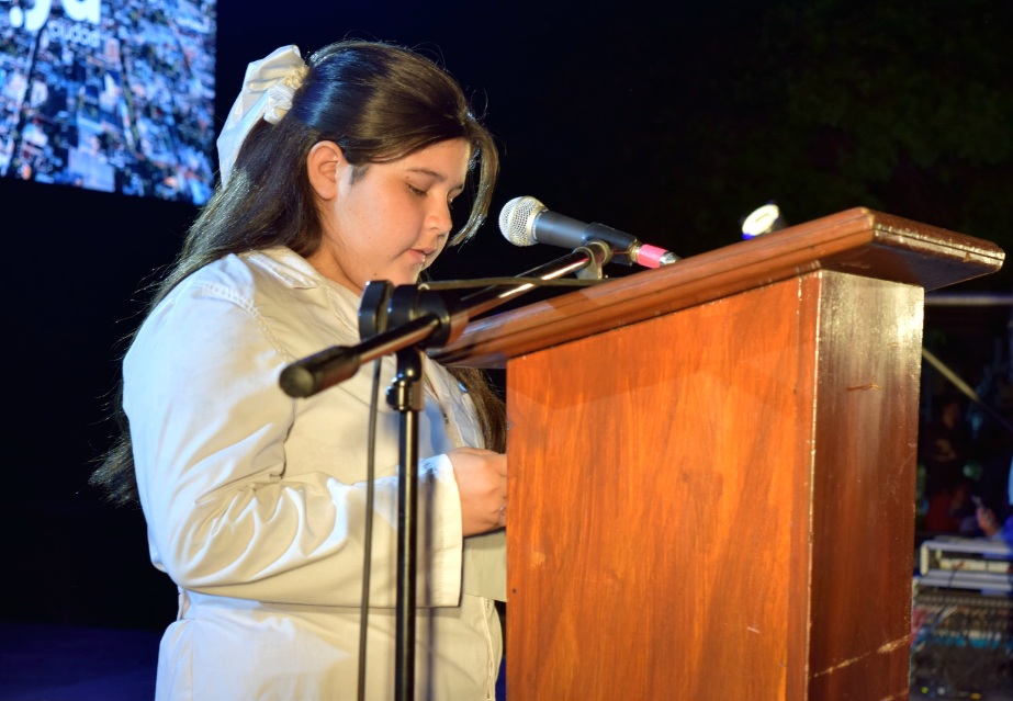 “Muy buenas noches, señor Intendente, autoridades y público en general. Hoy estoy muy contenta de estar acá, representando a mi escuela ‘Doña Goya’, una escuela que lleva el nombre de la mujer que dio identidad a nuestra ciudad”, comenzó con seguridad y ternura.