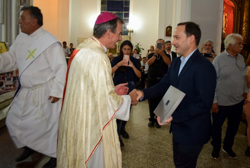 El intendente municipal junto a la secretaria de Educación Sonia Espina participó de la celebración litúrgica en la iglesia Catedral. Como muestra del afecto, respeto y la permanente vinculación con el pastor Diocesano, Mariano Hormaechea le entregó un presente a monseñor Canecín.