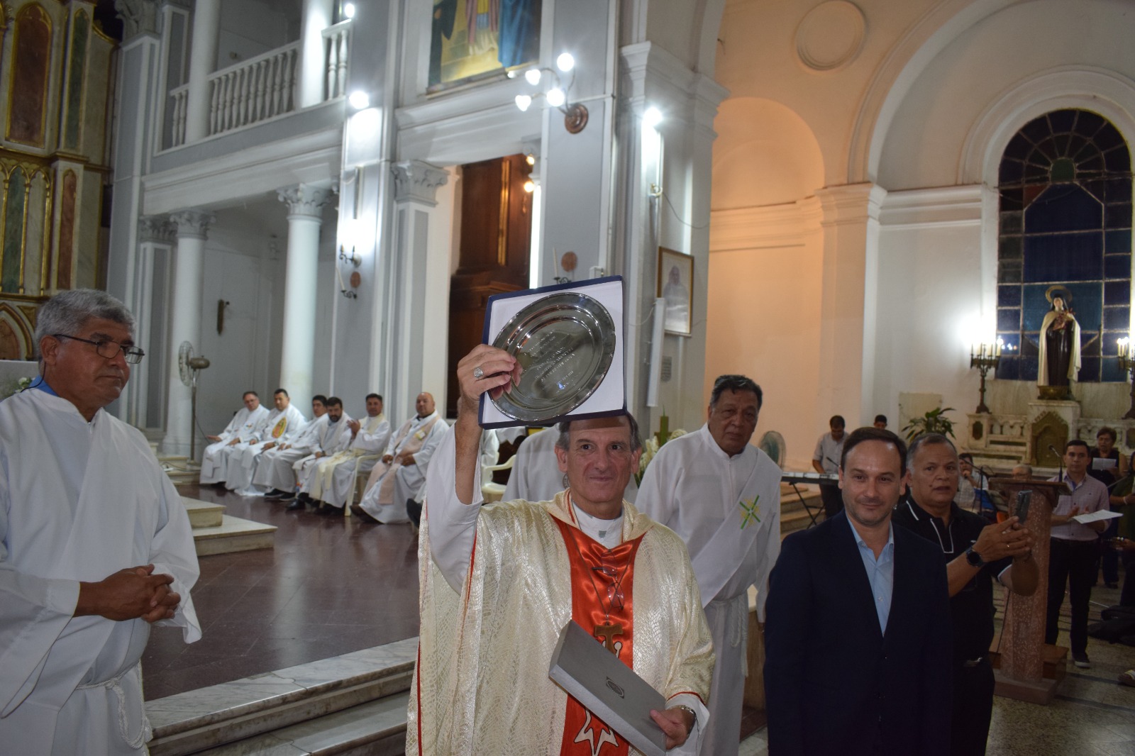 El intendente municipal junto a la secretaria de Educación Sonia Espina participó de la celebración litúrgica en la iglesia Catedral. Como muestra del afecto, respeto y la permanente vinculación con el pastor Diocesano, Mariano Hormaechea le entregó un presente a monseñor Canecín.