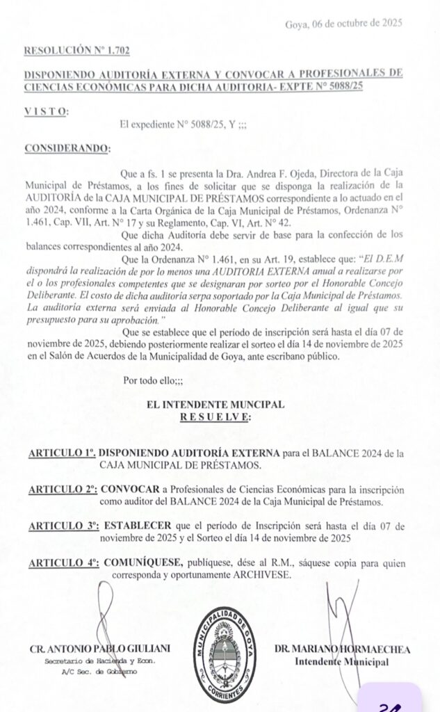 ARTICULO 1°. DISPONIENDO AUDITORÍA EXTERNA para el BALANCE 2024 de la CAJA MUNICIPAL DE PRÉSTAMOS.