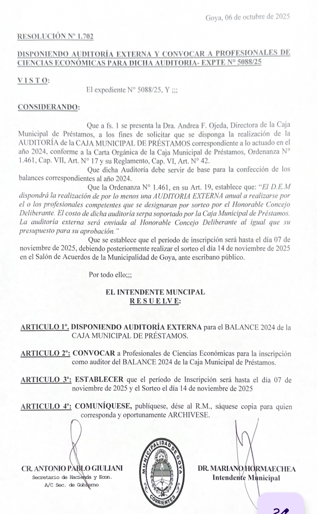 ARTICULO 2°: CONVOCAR a Profesionales de Ciencias Económicas para la inscripción como auditor del BALANCE 2024 de la Caja Municipal de Préstamos.