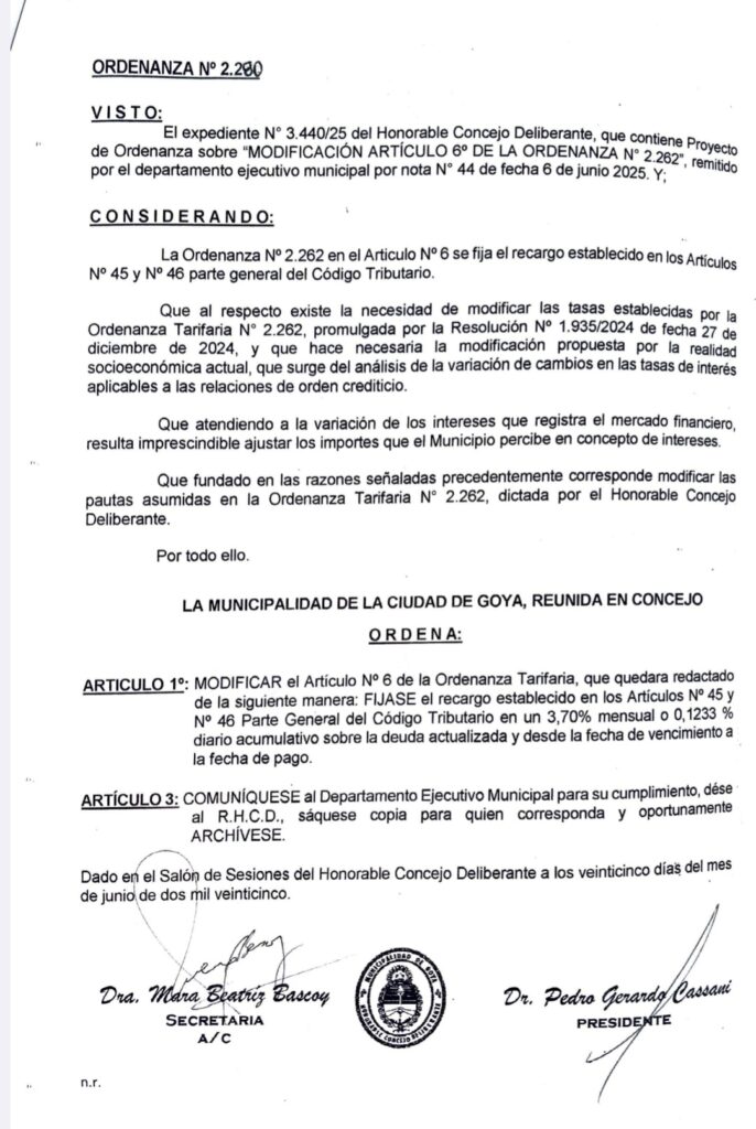 El expediente Nº 3.440/25 del Honorable Concejo Deliberante que contiene Proyecto de Ordenanza sobre «MODIFICACIÓN ARTÍCULO 6° DE LA ORDENANZA Nº 2.262”, remitido por el departamento ejecutivo municipal por nota Nº 44 de fecha 6 de junio y