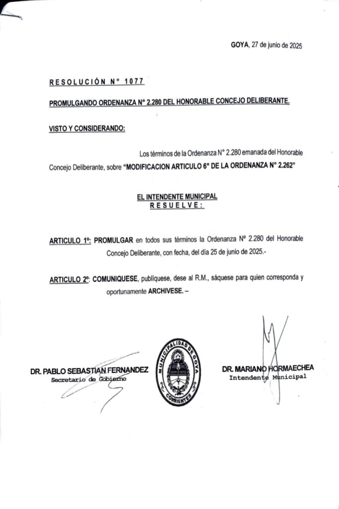 ARTÍCULO 1°: PROMULGAR en todos sus términos la Ordenanza Nº 2.280 del Honorable Concejo Deliberante, con fecha, del día 25 de junio de 2025.-