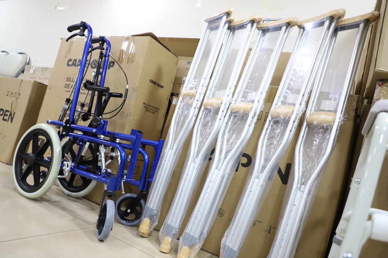Para el Instituto de Ayuda al Lisiado (ICAL): 5 Andadores para adultos, 10 Sillas de rueda, 5 Muletas, 5 Bastones trípodes,10 bastones canadienses, 5 inodoros portátiles, 5 bastones