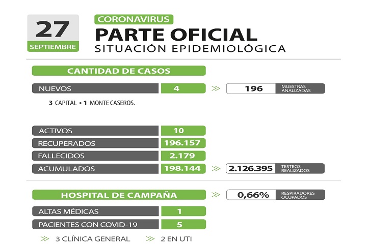 La cifra de casos activos se actualiza a 10 y los acumulados en 198.144 en todo el territorio provincial, al 27 de septiembre de 2023, con 2.126.395 testeos realizados desde que inició la pandemia y 196.157 recuperados; mientras que son 2.179 los fallecidos acumulados.