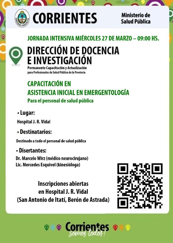 Así, la apertura será el miércoles 27 de marzo a partir de las 9 en el hospital J. R. Vidal de la localidad de Berón de Astrada, con el lanzamiento de las Jornadas de Capacitación en Asistencia Inicial en Emergentología, que vienen realizándose desde el 2022, con un programa actualizado y necesario para atender las demandas de los hospitales de toda la provincia. Está dirigida a médicos, kinesiólogos, enfermeros, paramédicos, técnicos diversos y personal de apoyo hospitalario.
