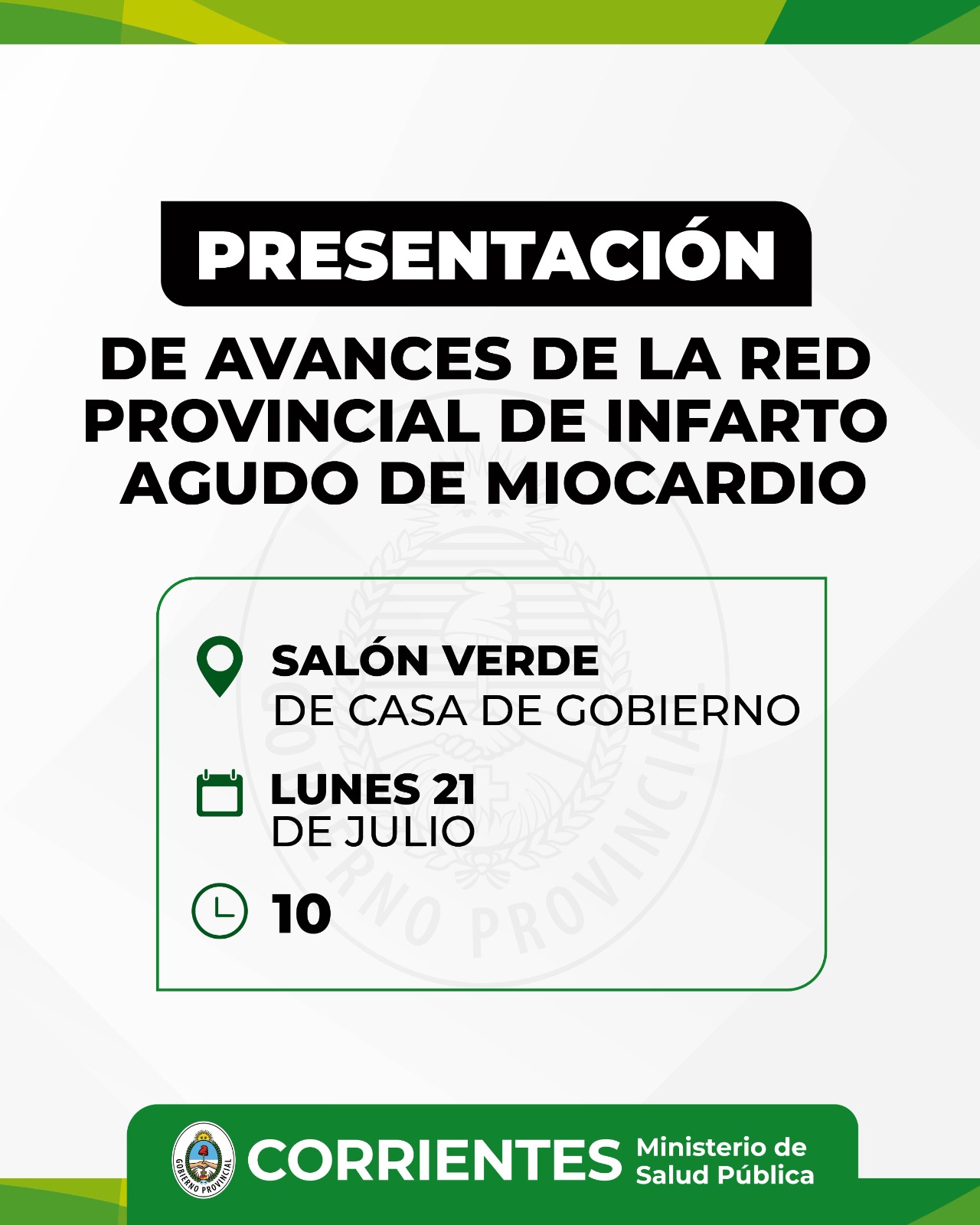 El ministro de Salud Pública, Ricardo Cardozo, junto a los referentes provinciales, presentará los avances de la Red Provincial de Infarto Agudo de Miocardio. Será el lunes 21 de julio a las 10 en el Salón Verde de Casa de Gobierno.
