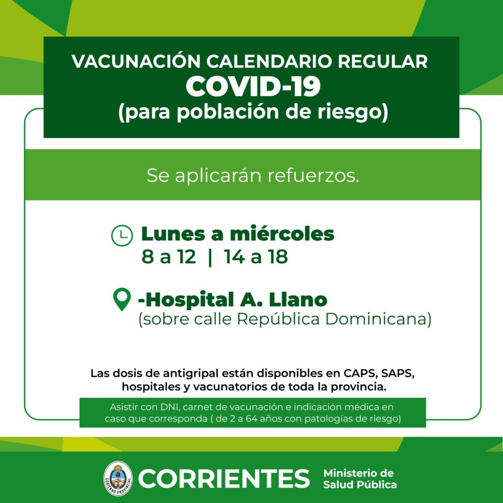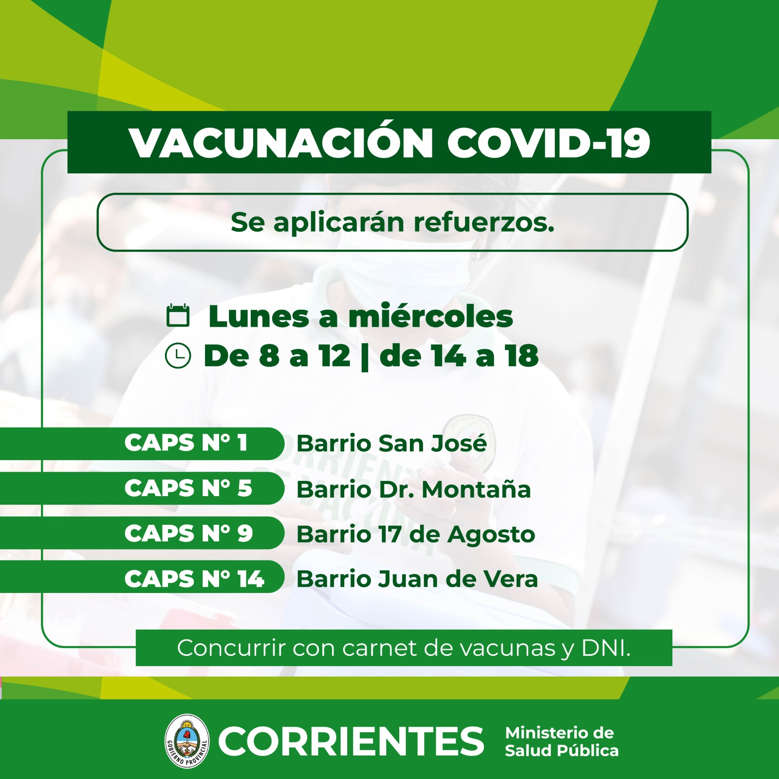 En la capital, las dosis están disponibles en los Centros de Atención Primaria de la Salud (Caps), en las Salas de Atención Primaria de la Salud (Saps) de la Municipalidad de Corrientes y en los vacunatorios de los hospitales Ángela I. de Llano y pediátrico Juan Pablo II. En tanto, en el interior las dosis están disponibles en los distintos vacunatorios.