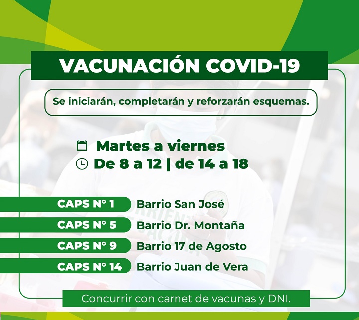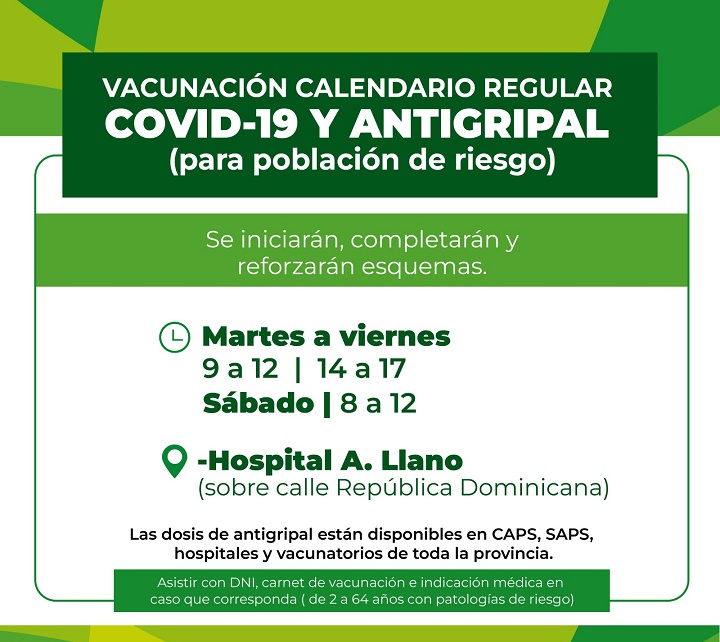 El Ministerio de Salud Pública de la Provincia, a través de la Dirección de Inmunizaciones, recuerda quiénes deben recibir la vacuna antigripal y refuerzos por Covid-19. Además, se insiste en completar el calendario de vacunación: las vacunas son gratuitas y están disponibles en los centros de salud con vacunatorios.