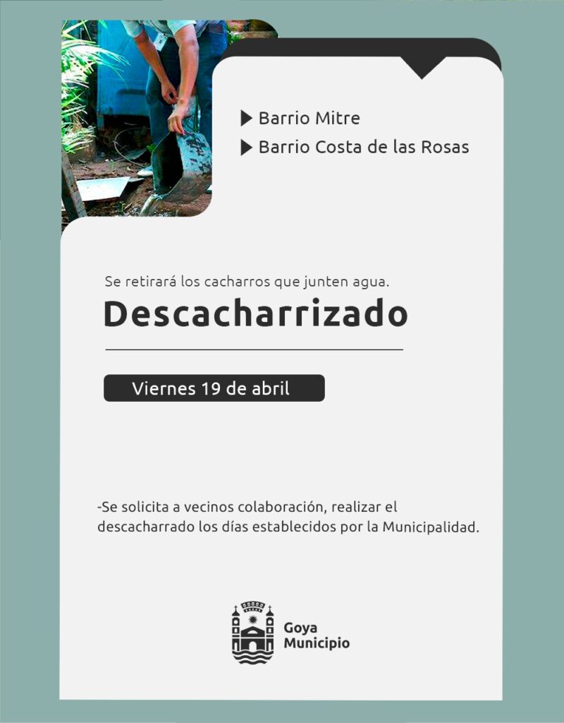 En la continuidad de la campaña de prevención del dengue, la Municipalidad de Goya realizará descacharrizado este 19 de abril en la zona norte.