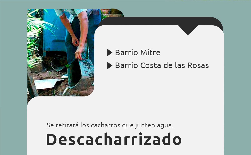 Se solicita a los vecinos de los barrios Mitre y Costa de las Rosas la colaboración para descartar los elementos que junten agua, sacar esos residuos el día indicado por la Municipalidad para el descacharrado.