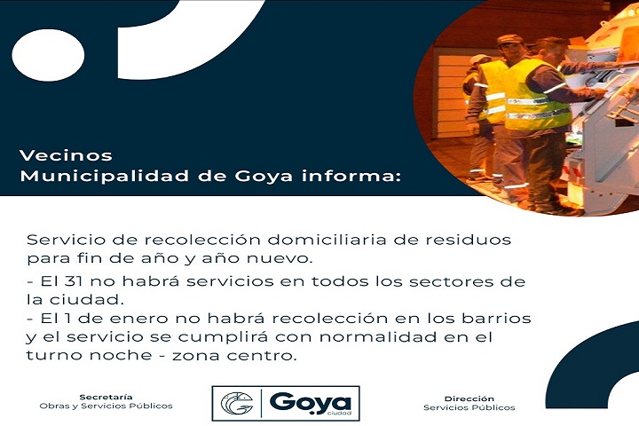 El 31 no habrá servicio de recolección en ningún sector de la ciudad, el 1 de enero se reanuda con el servicio nocturno en la zona céntrica de Goya.