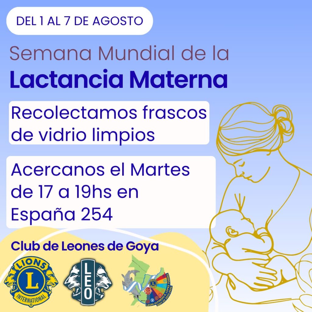En adhesión a la semana de la lactancia materna del 1 al 7 de agosto, el Club Leones Goya propone la recolección de frascos de vidrios limpios, las personas que pueden aportar estos elementos deberán acercar a la Sede del Club, España 254, el martes de 17 a 19 horas.
