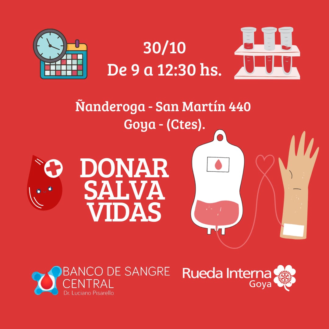 Organizada por la Rueda Interna del Rotary Club Goya, el día miércoles 30 de octubre de 9 a 12:30 hs, en Ñanderoga, San Martín 440, el equipo de Hemodonación del Banco de Sangre Central de Corrientes realizará una campaña de colecta externa de sangre.