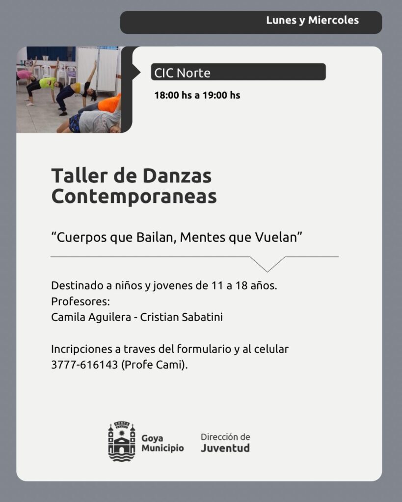La Municipalidad de Goya, a través de la Dirección de Juventud, presenta la apertura del Taller de Danzas Contemporáneas «Cuerpos que Bailan, Mentes que Vuelan».