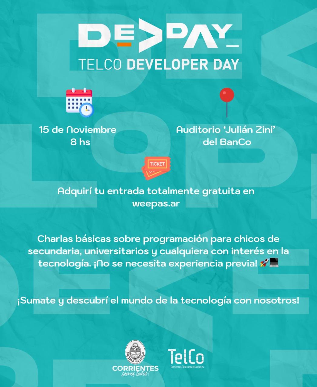 En un esfuerzo por fomentar la educación tecnológica en la comunidad, TelCo organiza el Dev Day 2024 en el Auditorio Julián Zini del Banco de Corrientes, un evento pensado para estudiantes de nivel secundario, universitario y para todo público interesado en la tecnología. Será este viernes 15 desde las 8.