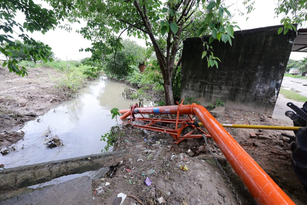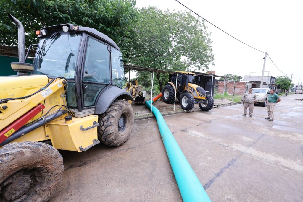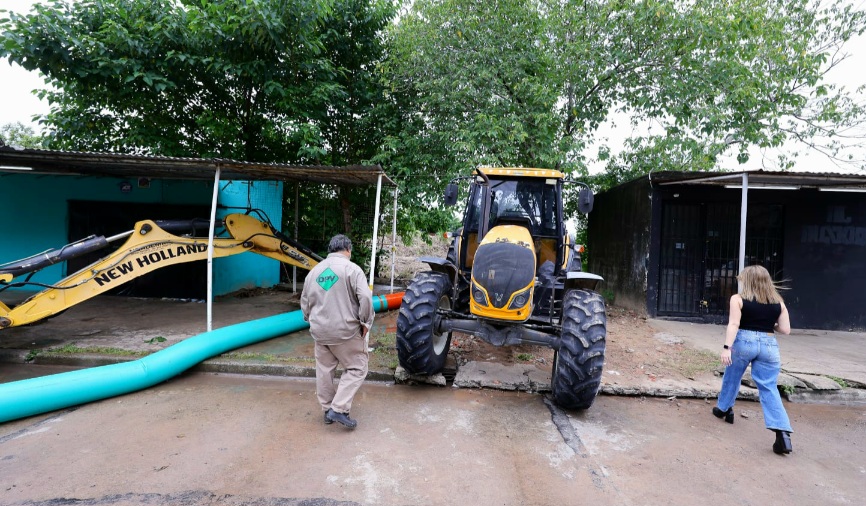 Es así que en el Barrio La Olla, se realizan tareas de desagote con tractor y bomba, para aliviar el agua acumulada y asistir también a las zonas aledañas.