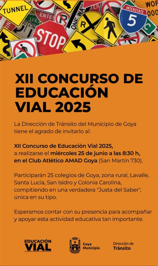 La Dirección de Tránsito del Municipio de Goya invita a toda la comunidad a acompañar el XII Concurso de Educación Vial 2025, que se desarrollará este miércoles 25 de junio, a partir de las 8:30 horas, en las instalaciones del Club Atlético AMAD, ubicado en San Martín 730.