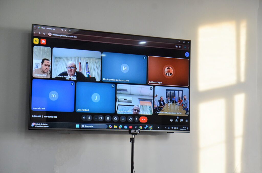 El intendente Mariano Hormaechea junto a su par de Reconquista Enrique Vallejos, en una reunión vía zoom, donde además participaron la secretaria de Industria y Comercio de la Municipalidad de Goya María Paz Lampugnani, el subsecretario de Producción del Municipio de Reconquista Luis Manzur, el presidente de la Asociación de Comercio de Goya Iván Vilas, el titular de la Cámara Empresarial Miguel Galarza, por la Sociedad Rural Goya su presidente Gastón Giqueaux, por la Asociación Parque Industrial Mauricio Álvarez, por la AGENPRO Fernando Martínez, el presidente de la Cámara de Comercio Exterior de Reconquista José Falcone, Marcelo Ala, Guillermo Yapur y Dante Sartor, empresarios del norte santafesino, integrantes de la Cámara de Comercio Exterior.