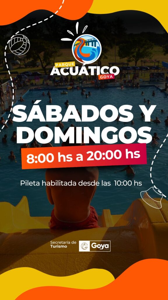 Al final de la entrevista mantenida en Radio Ciudad, el secretario de Turismo de la Municipalidad de Goya recordó que el viernes se habilita la temporada en el Parque Acuático Goya, de 14 a 20 horas, sábados y domingos de 8 a 20 horas”.