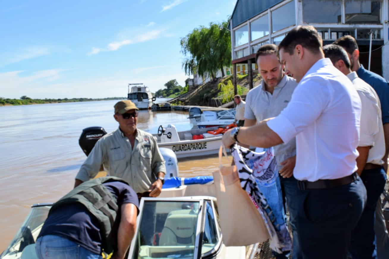 Antes de partir hacia la expedición náutica se vivió un momento cargado de identidad y promoción turística: el presidente de la COMUPE, Raúl “Bucky” González Vilas, junto a Mariano Hormaechea, obsequiaron al ministro provincial una remera oficial de pesca de la Fiesta Nacional del Surubí, destacando que se trata de una fiesta única en el mundo y emblema indiscutido de la identidad goyana.