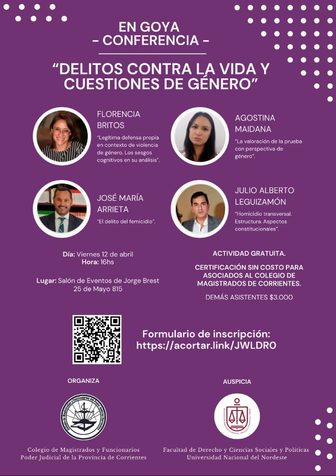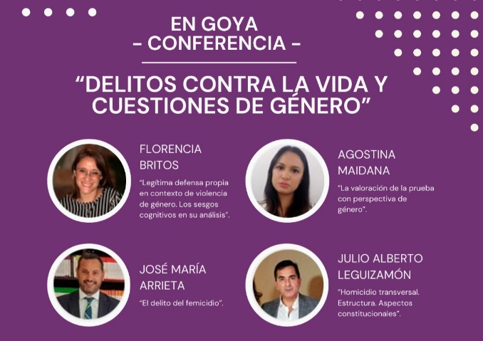 El viernes 12 de abril, a las 16 horas, se llevará a cabo una relevante conferencia en la ciudad de Goya, bajo el título “Delitos Contra la Vida y Cuestiones de Género”. El evento se realizará en el salón de Eventos de Jorge Brest, ubicado en la calle 25 de Mayo N°815.